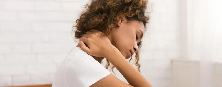 Neck pain typically runs from the base of a person’s skull to the top of their shoulder blades and settles in the back of the neck.